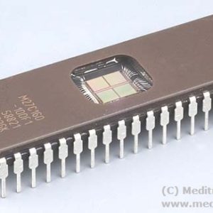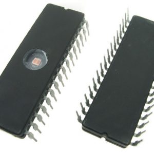 Memoria EPROM de 256K (32K x 8) de bajo costo, el tiempo de acceso es menor a 45ns. Tiene una ventana transparente que permite al usuario exponerla a luz UV y borrar su programación.